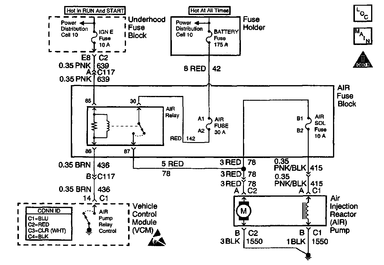 An AIR pump is used on this vehicle to lower tail pipe emissions on start-up. The VCM supplies a ground to the AIR pump relay in order to energize the AIR pump and the AIR solenoid.
