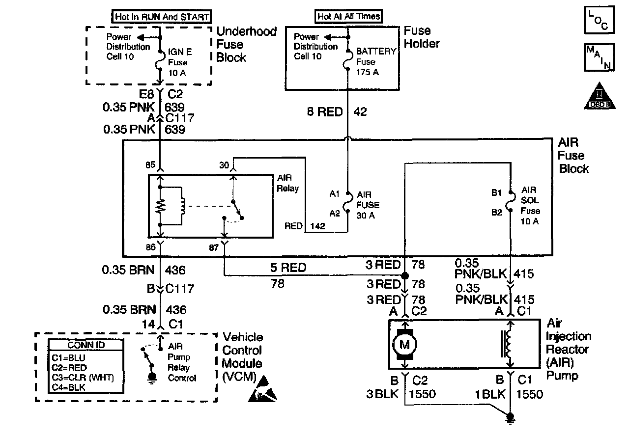 An AIR pump is used on this vehicle to lower tail pipe emissions on start-up. The VCM supplies a ground to the AIR pump relay, which energizes the AIR pump and the AIR solenoid.