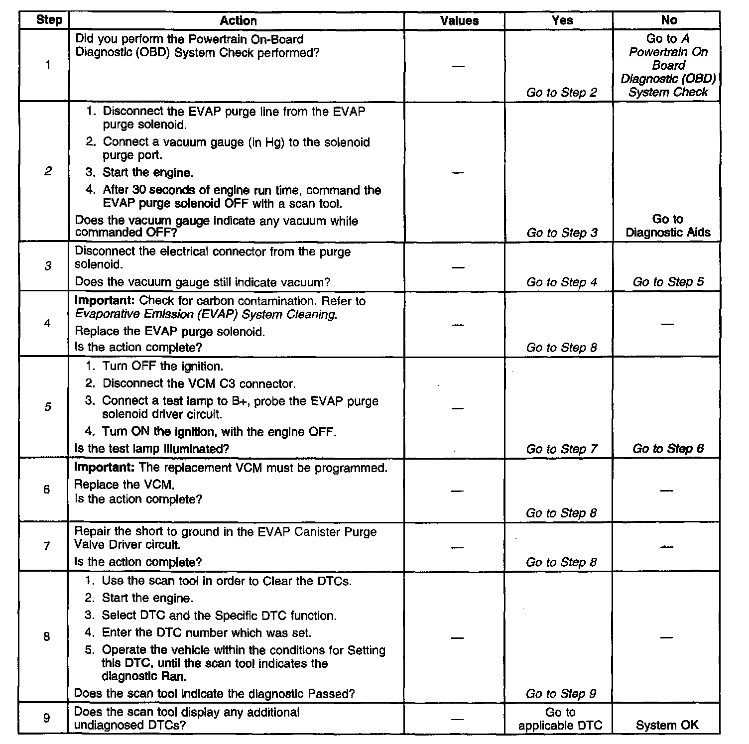 IMPORTANT: An accurate indication of fuel level is required for the VCM to properly Pass or Fail this DTC. Always diagnose fuel level sensor DTCs before performing this DTCs diagnostic table. Always check for fuel level sensor DTCs stored in History.
