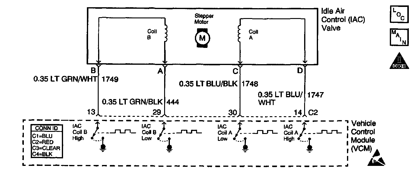 The control module controls idle speed with an Idle Air Control (IAC) valve. The desired RPM is based on sensor inputs and the actual engine RPM. Four circuits are used in order to control the IAC valve, allowing a precise amount of air into the intake manifold. In order to increase the idle RPM, the control module will command the valve pintle to move away from its seat, allowing more air to bypass the throttle plate. To decrease RPM, the control module commands the IAC pintle to move closer to its seat, causing a lower airflow to bypass the throttle plate. A scan tool will display the control module commands to the IAC valve in counts. The higher the counts, the more air is allowed to bypass the throttle plate. Lower counts indicate that less air is commanded by the control module.