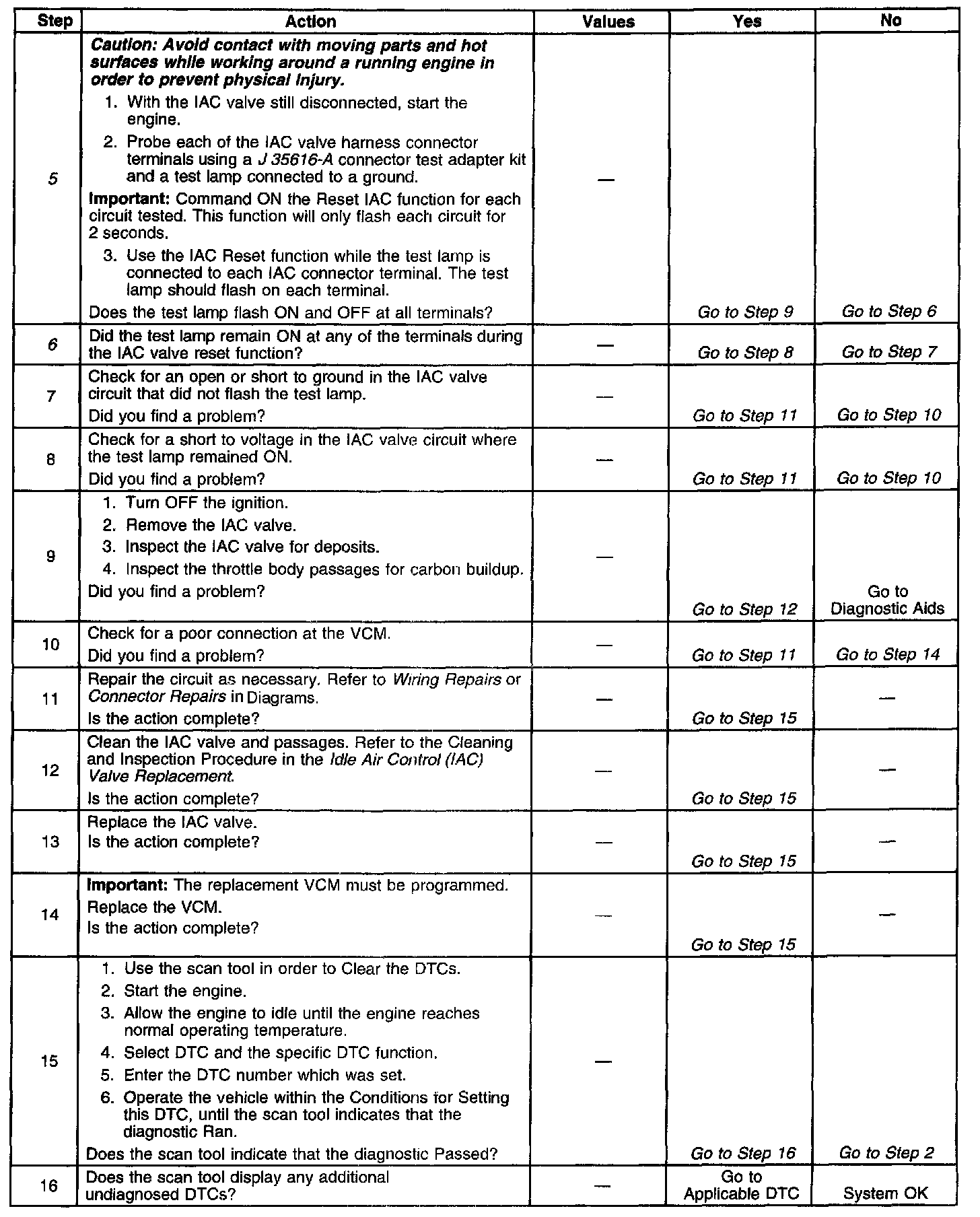 This DTC can be set by an IAC valve which has stopped and is not responding to the VCM, a throttle stop screw that has been tampered with, or a damaged throttle or throttle linkage. A slow, unstable, or fast idle may be caused by a non-IAC valve system problem that cannot be overcome by the IAC valve. Out of range control IAC scan tool counts will be above 60 if the idle is too low and zero if the idle is too high. Check for the following conditions.