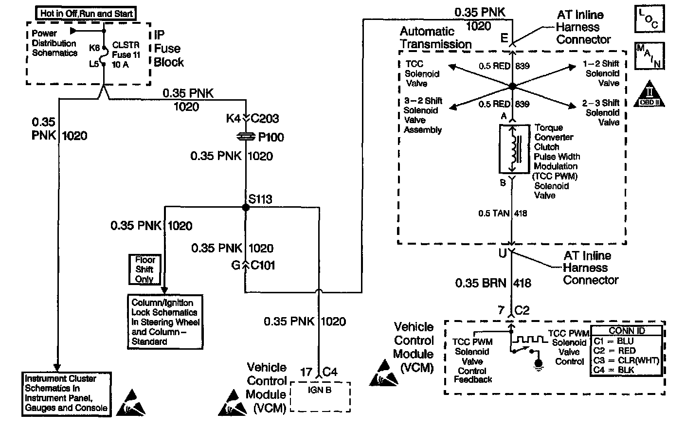 The Torque Convener Clutch Pulse Width Modulation (TCC PWM) solenoid valve controls the fluid acting on the convener clutch valve. The converter clutch valve controls the TCC application and release. The solenoid attaches to the control valve body within the transmission. The solenoid receives ignition voltage through circuit 1020. The Vehicle Control Module (VCM) controls the solenoid by providing a ground path on circuit 418. Current flows through the solenoid coil according to the duty cycle (percentage of ON and OFF time). The TCC PWM solenoid valve provides a smooth engagement of the TCC by operating during a duty cycle percent of ON time.