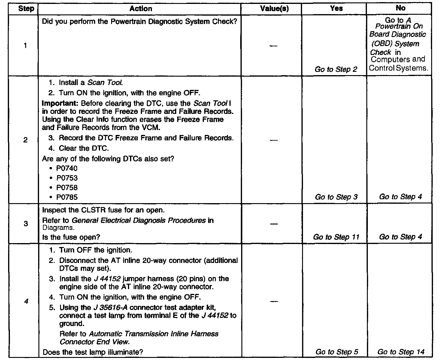 The numbers below refer to the step numbers on the diagnostic table.