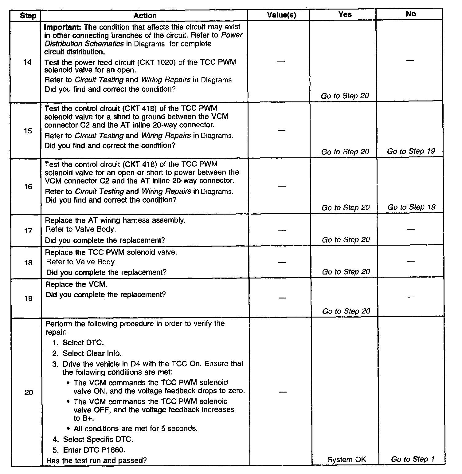 7. This step tests the resistance of the TCC PWM solenoid valve and the Automatic Transmission (AT) wiring harness assembly.