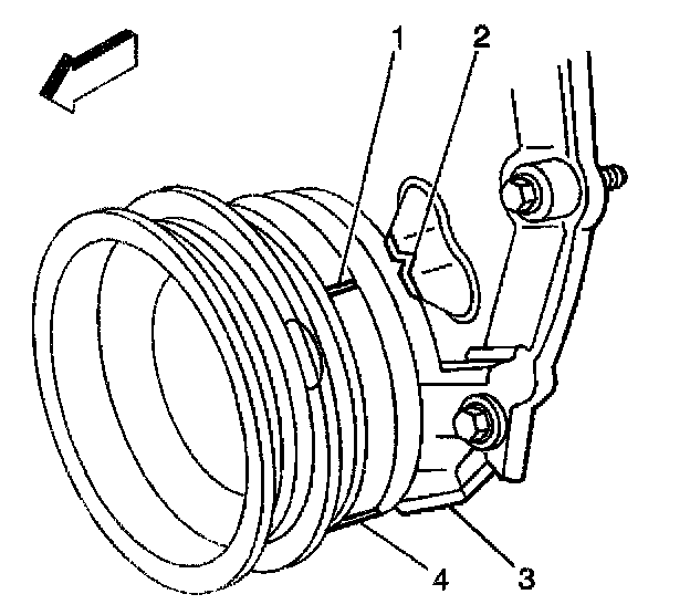5. Rotate the crankshaft balancer to position the crankshaft balancer alignment mark (1) 57 - 63 degrees clockwise or counterclockwise from the engine front cover alignment tab (2).