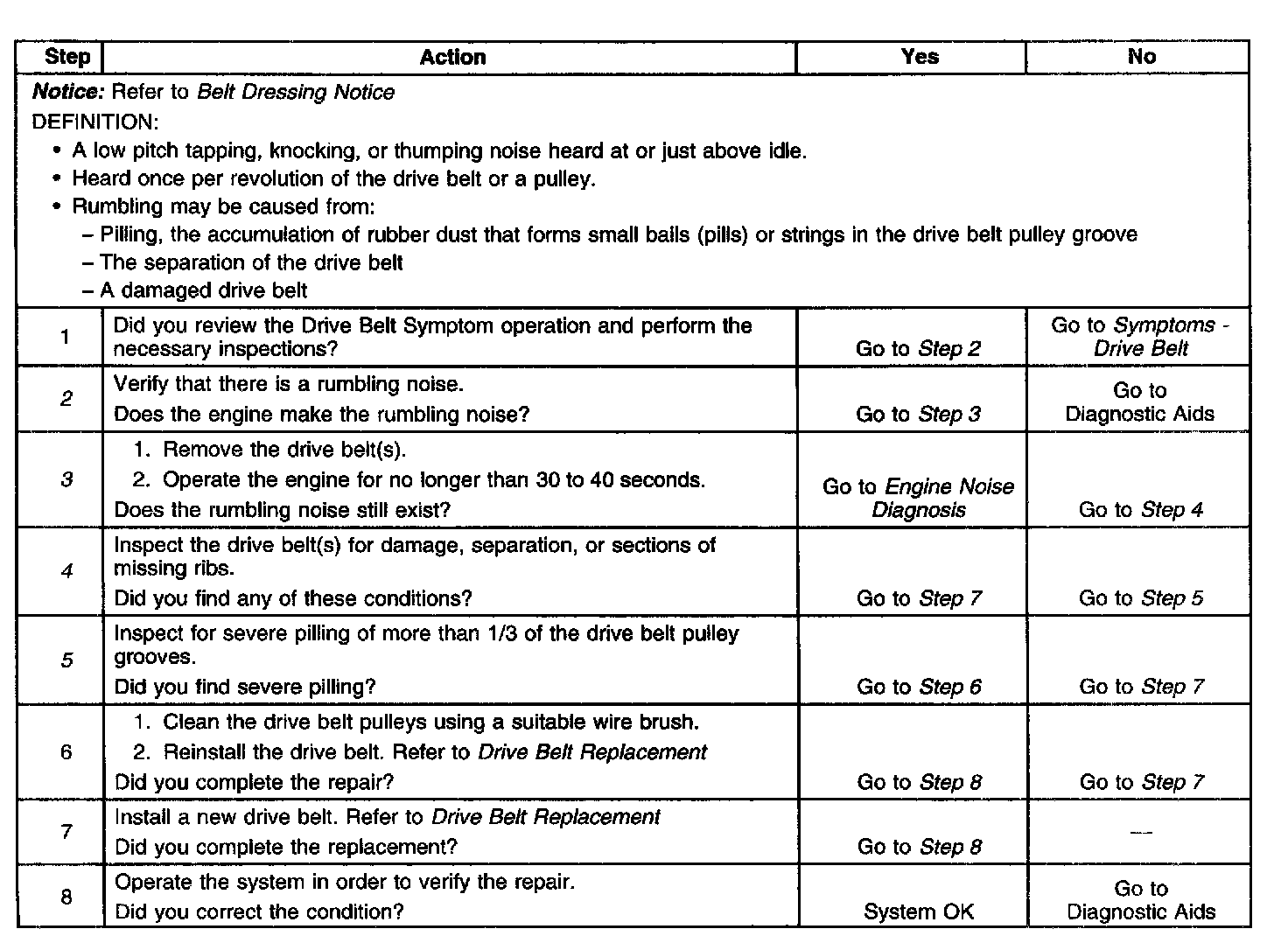 3. This test is to verify that the drive belt(s) is causing the rumbling noise. Rumbling noise may be confused with an internal engine noise due to the similarity in the description. Remove only one drive belt at a time if the vehicle has multiple drive belts. When removing the drive belt the water pump may not be operating and the engine may overheat. Also DTCs may set when the engine is operating with the drive belt removed.