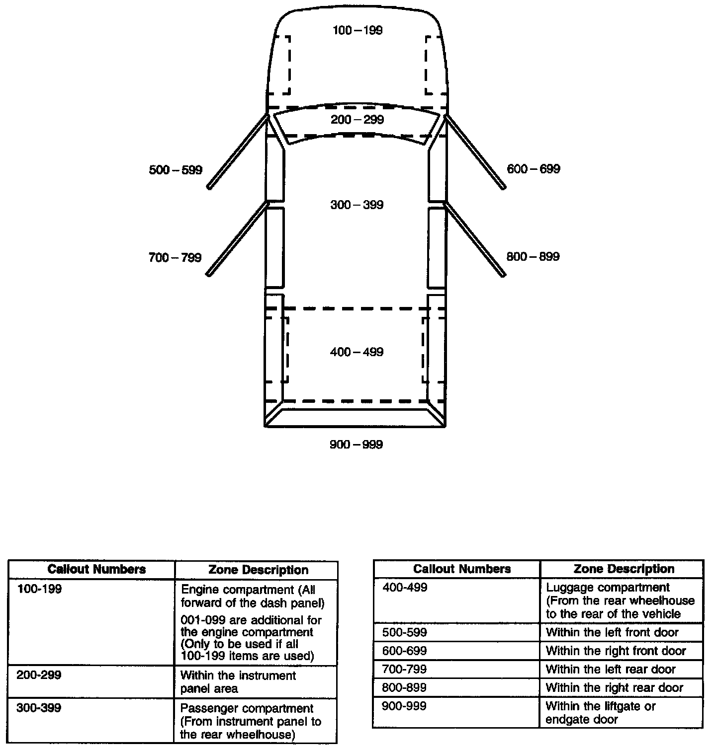All grounds, in-line connectors, pass-through grommets, and splices have identifying numbers that correspond to where they are located in the vehicle. The following table explains the numbering system.
