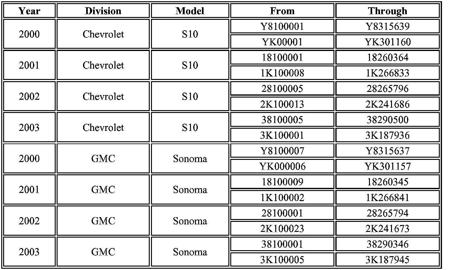 Involved are certain 2000-2003 Chevrolet S10 and GMC Sonoma vehicles built within the VIN breakpoints shown.