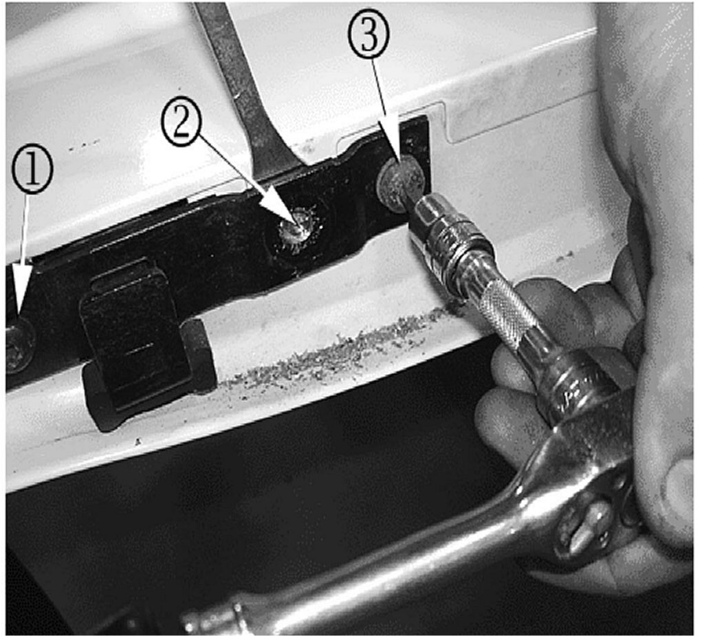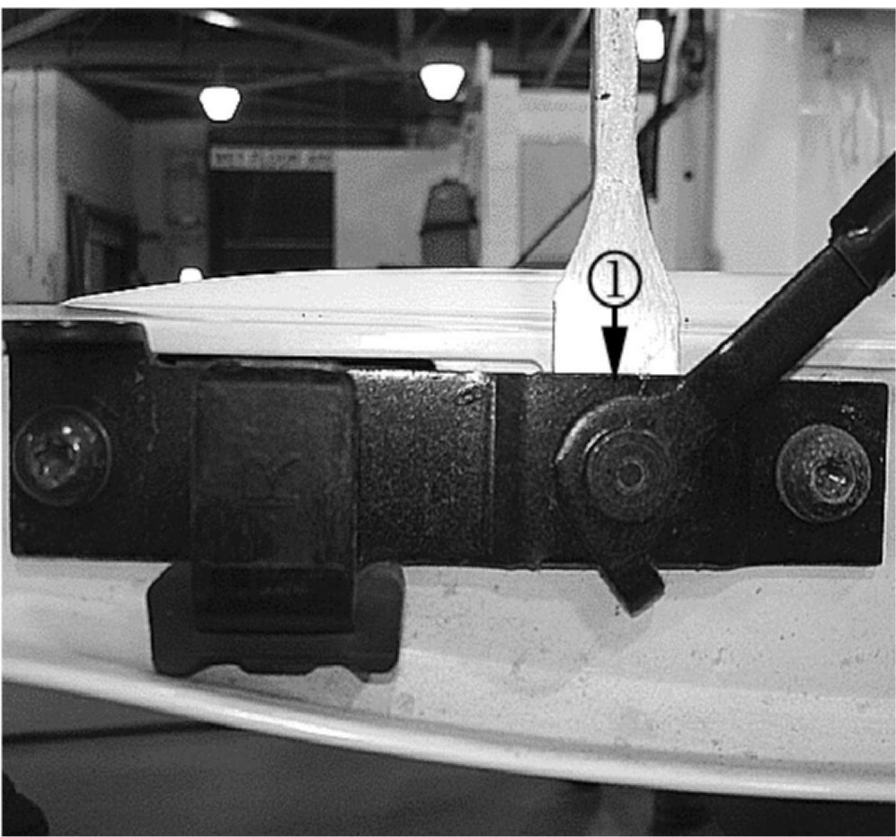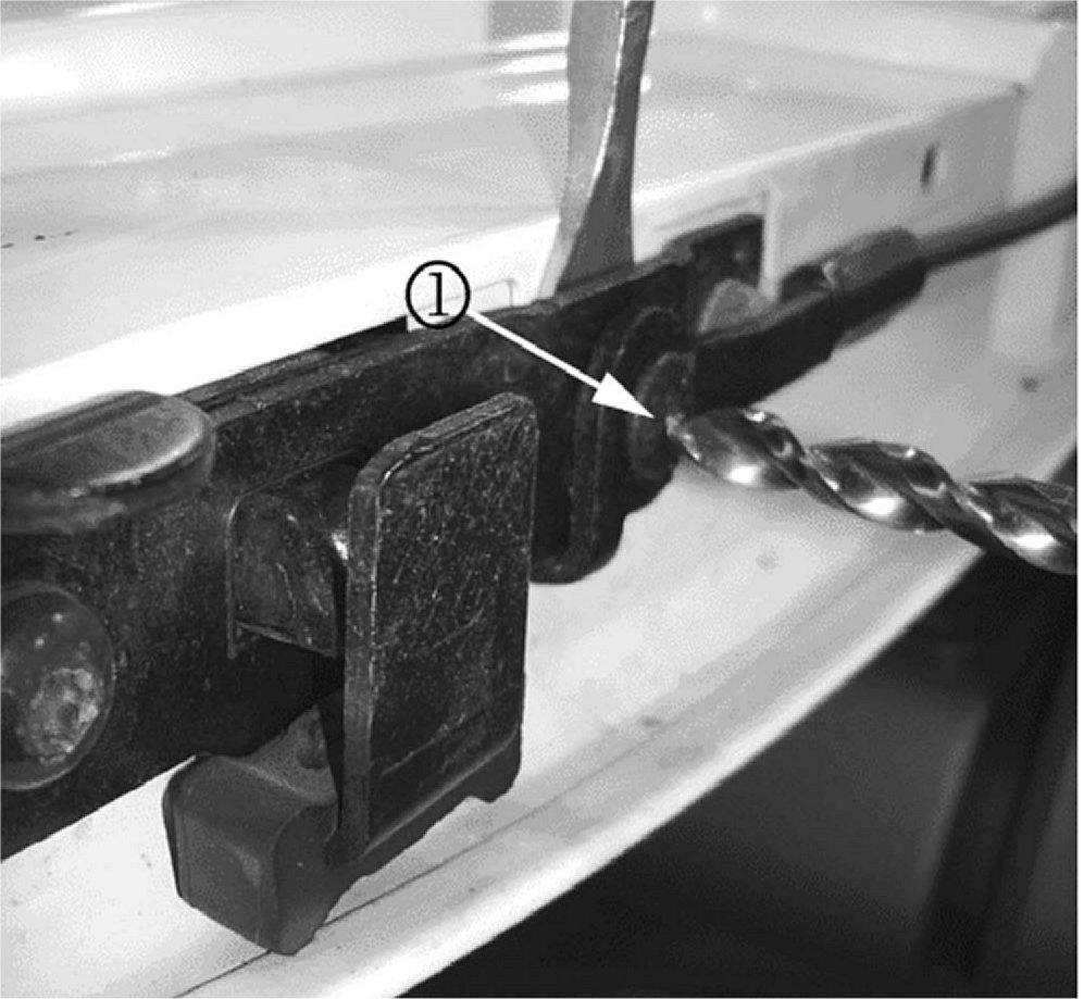 4. Drill out the rivet (1) on the latch assembly using a 9.5 mm (3/8 in) drill bit.