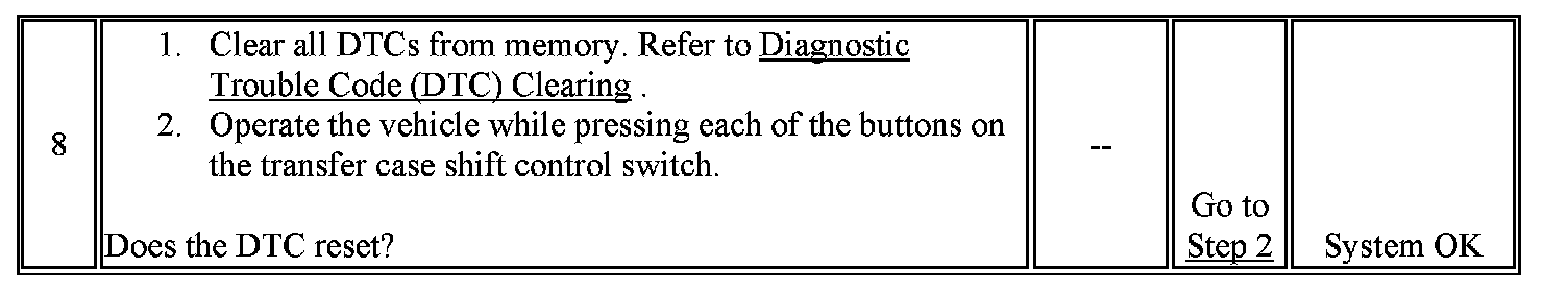 During electronic shifting, the transfer case shift control module monitors the transfer case encoder circuit for the proper operating sequence. If at any time during a shift, the encoder changes from one position to any position other than the next possible position, an error counter in the transfer case shift control module increments by four. After the counter reaches 32, the transfer case shift control module set a DTC 2, a permanent "encoder fault," and reverts to a 2HI to 4LO or a 4LO to 2HI shift pattern only. To guard against a transient, random encoder fault due to vibration, dirt, electrical noise, etc., the fault counter reduces by one each time the transfer case shift control module detects a valid encoder value. The encoder must intermittently fail 25 percent of the time for the transfer case shift control module to consider it faulty and store DTC 2.