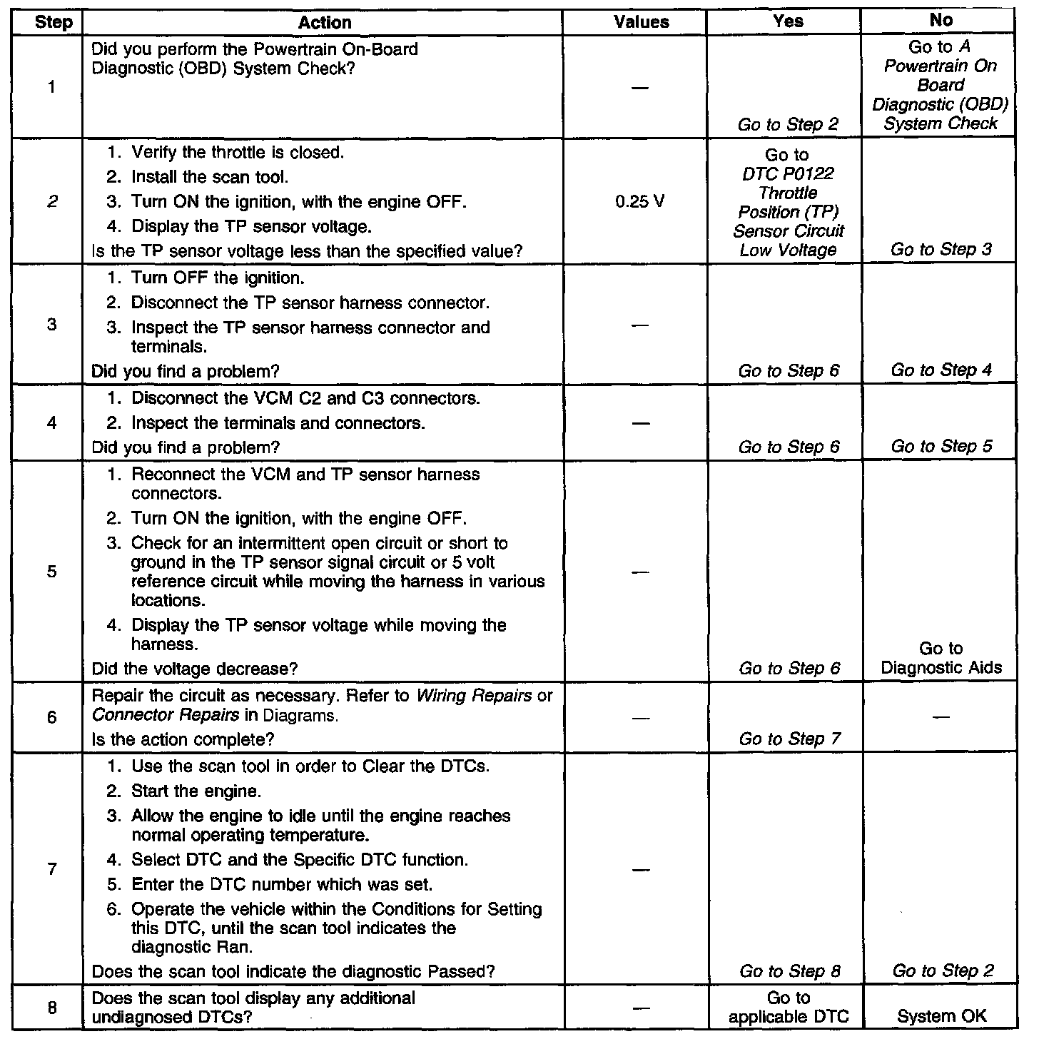 2. If the TP sensor voltage is less than 0.25 volts, then the condition is present.Even though DTC P0122 did not set, this DTC is more comprehensive and may aid in diagnosis.