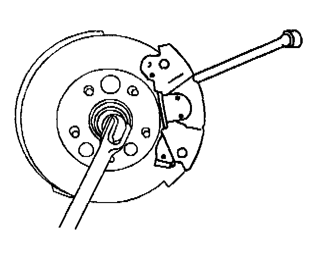 4. In order to prevent the drive axle from turning, insert a drift through the brake caliper and into one of the rotor vanes.