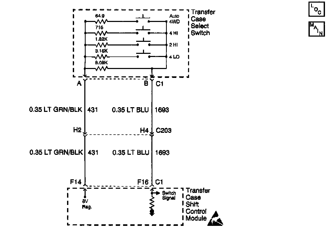 The range/mode switch circuit consists of four normally open switches. The transfer case shift control module supplies a regulated 8 volts, DC to the switch through the 8 V Reg. circuit. The current travel through a 9.09 K Ohm resistor located inside the switch. Then returns current to the transfer case shift control module through the switch signal circuit.