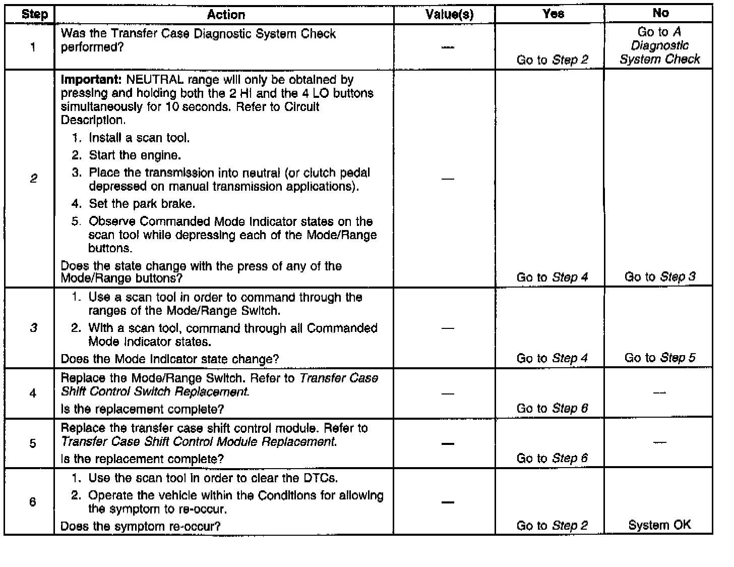 When each of the switches is depressed they will complete a circuit through their own specific resistor. The transfer case shift control module continuously monitors the switch input to determine whether the 4HI, AUTO 4WD, 2HI, and 4LO button selections are made by the driver. Neutral may be obtained if the following conditions are met: