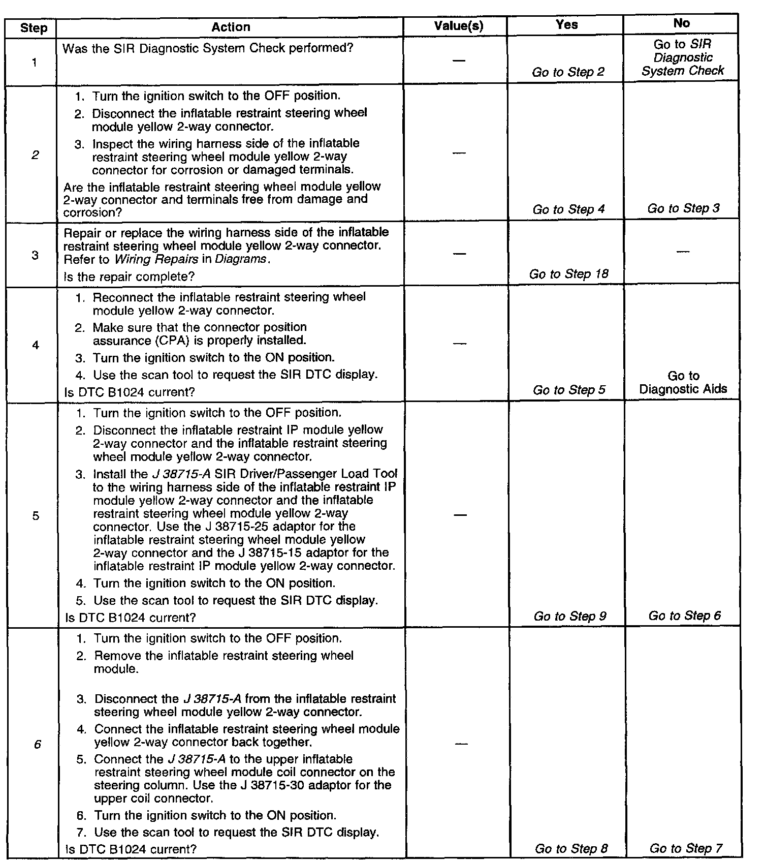 6. This step determines if the inflatable restraint steering wheel module coil or if the inflatable restraint steering wheel module is defective.