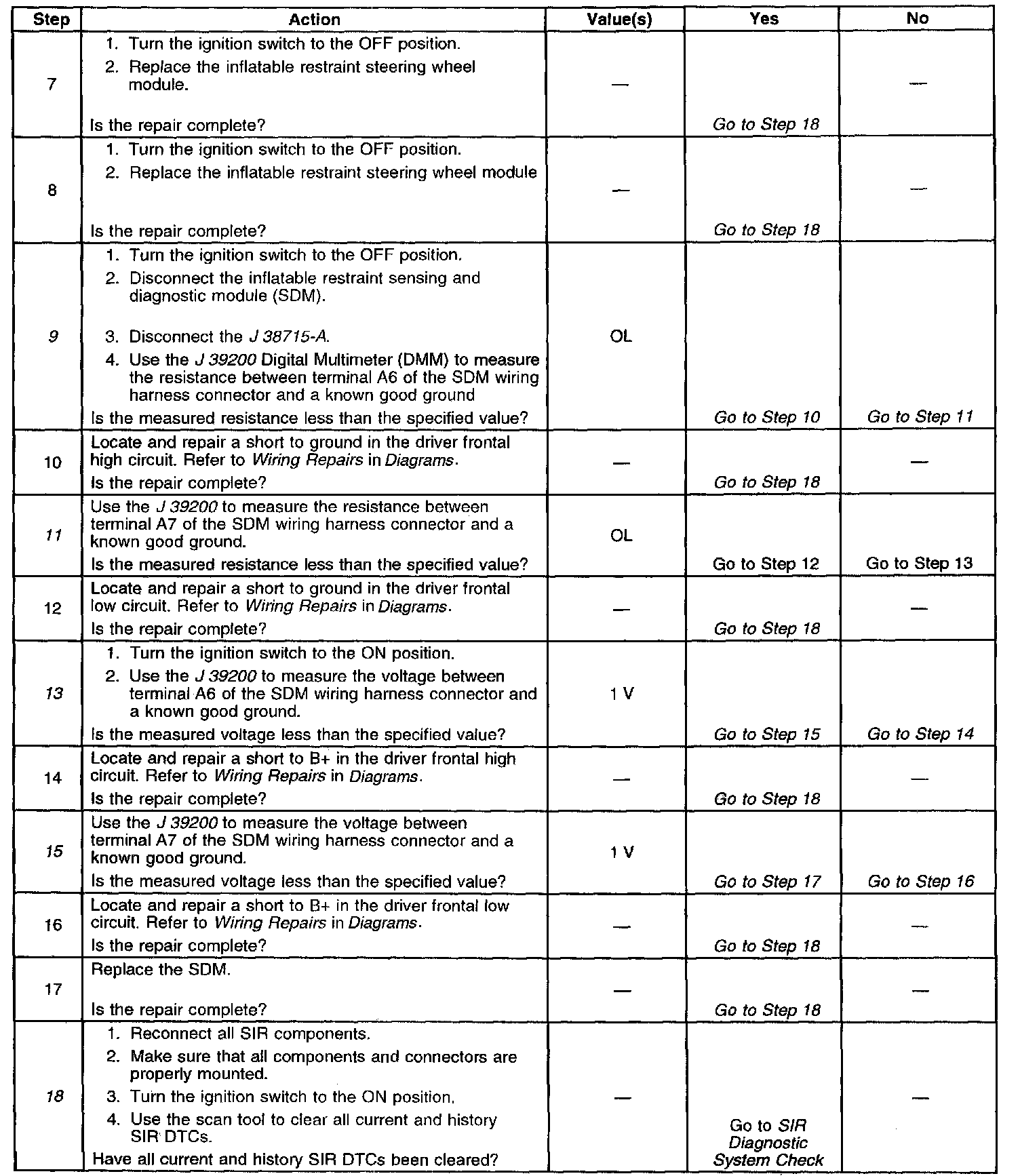 15. This step determines if there is a short to B+ in the driver frontal low circuit or if there is a malfunctioning SDM.