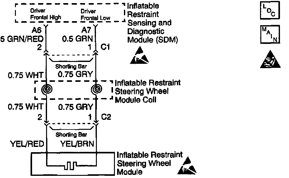 When you first turn the ignition switch to the ON position, the inflatable restraint sensing and diagnostic module (SDM) performs tests to diagnose critical malfunctions within itself. Then the SDM performs the following continuous diagnostic tests on the deployment loops: