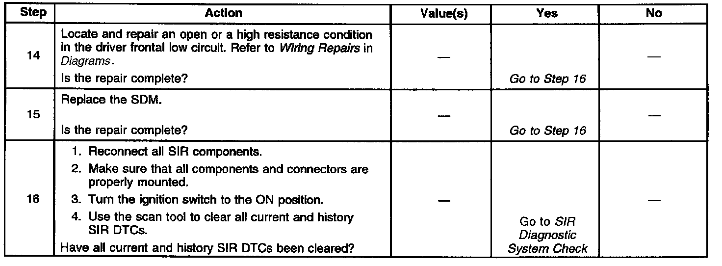 13. This step determines if there is an open or a high resistance condition in the driver frontal low circuit or if there is a malfunctioning SDM.