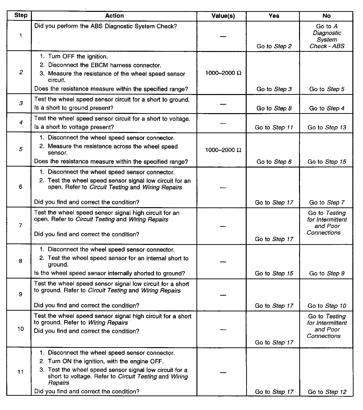 2. This step tests the wheel speed sensor and the wheel speed sensor signal circuits for an open.