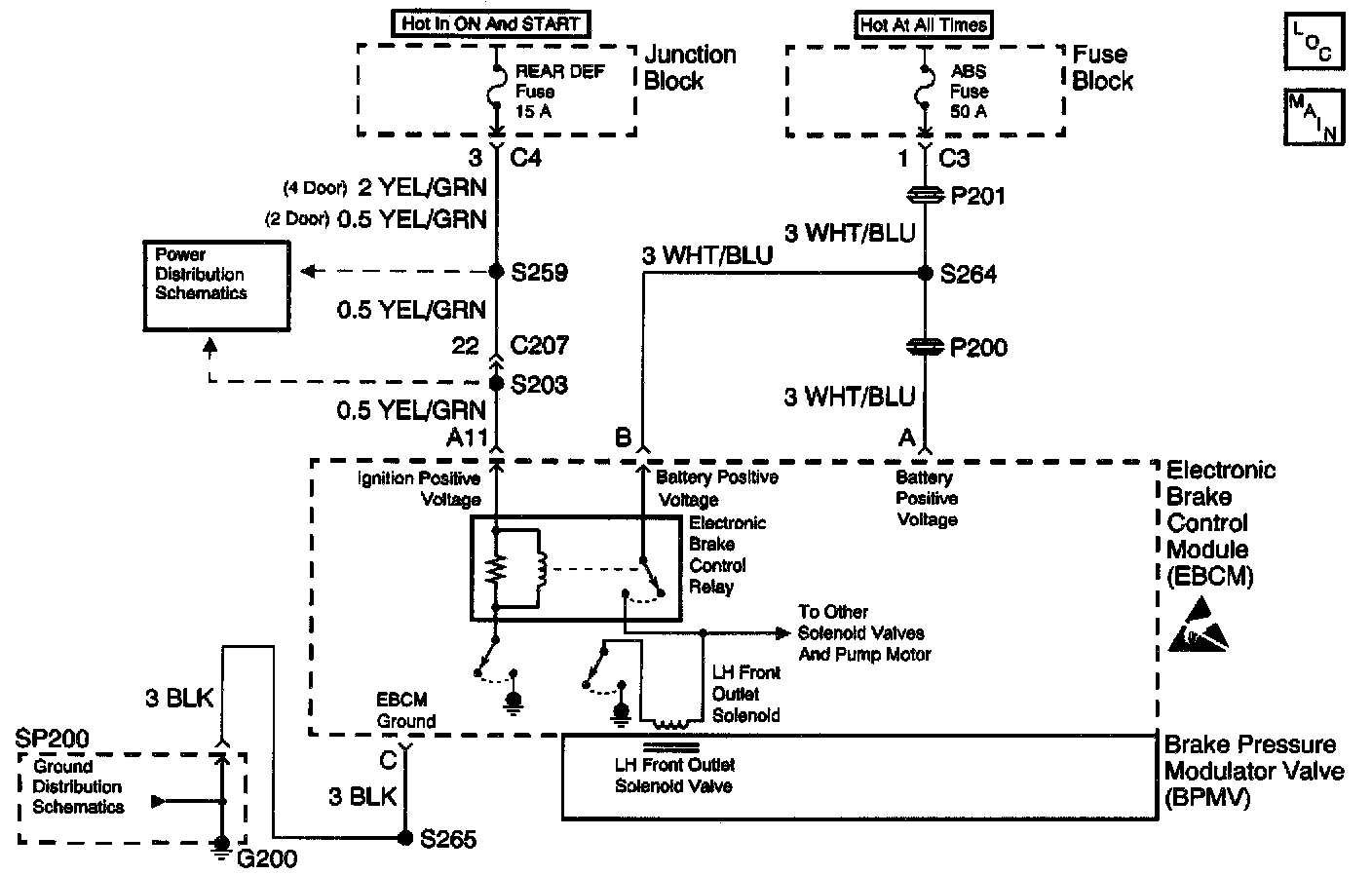 The Outlet valve solenoid circuits are supplied with battery power when the ignition is in the ON position. The EBCM controls the valve functions by grounding the circuit when necessary.