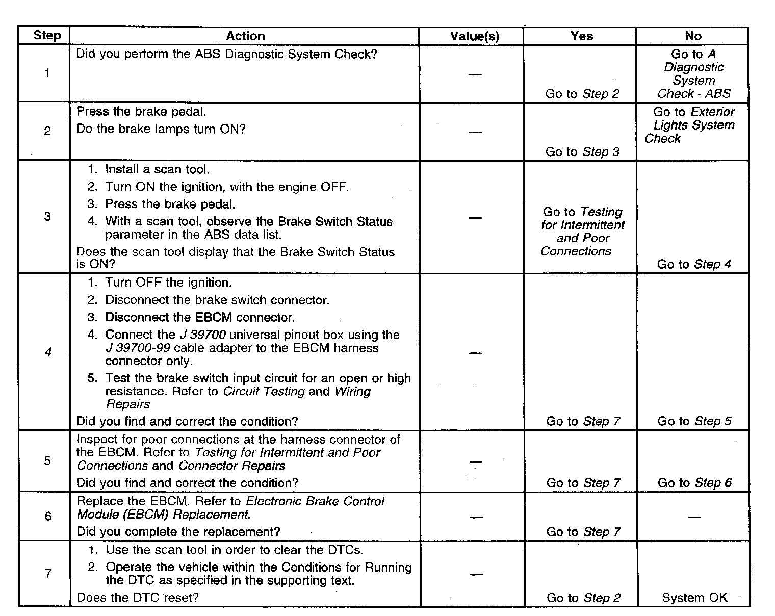 4. Tests the brake switch input circuit for an open or high resistance.