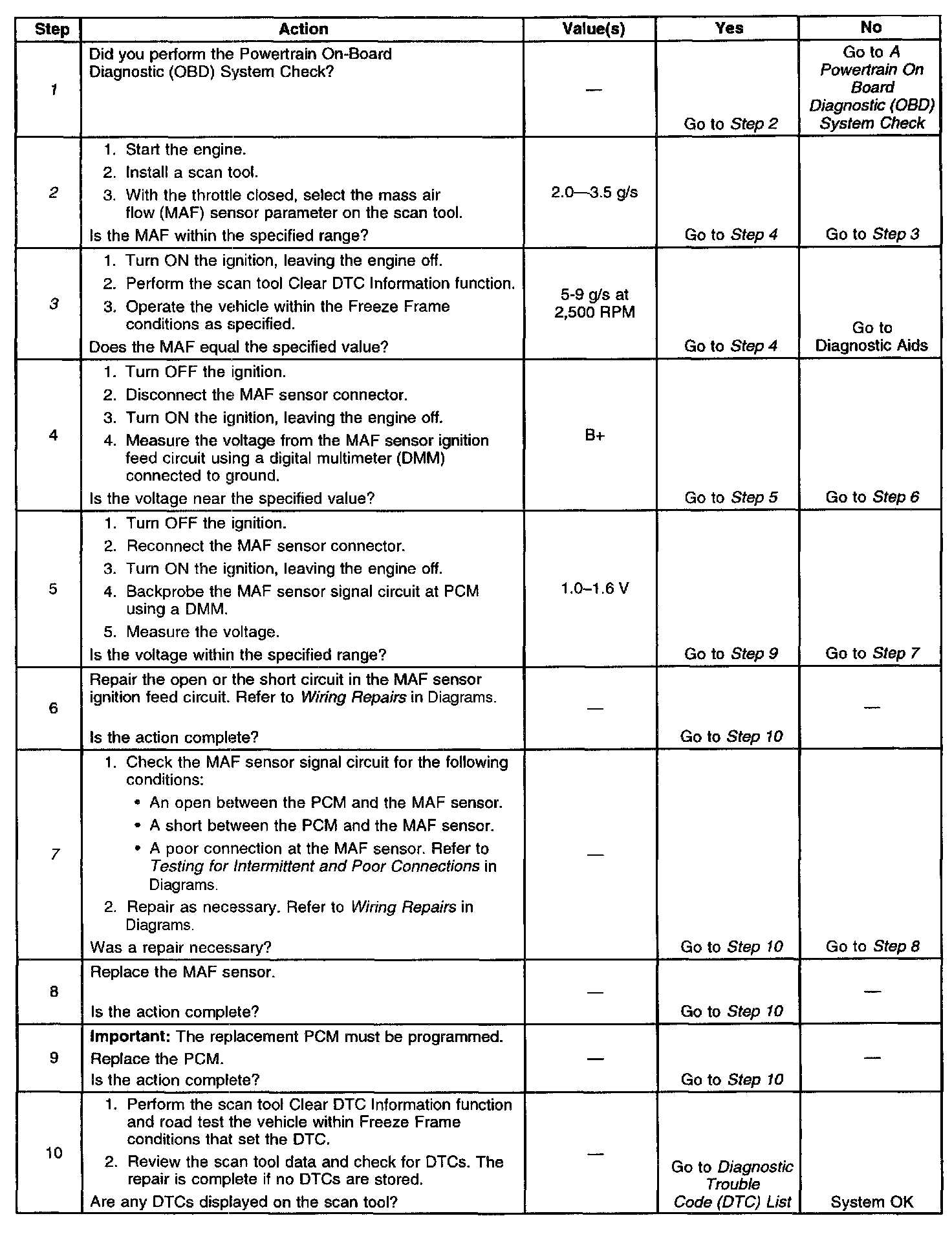 7. This step checks for an open or a short in the MAF sensor signal circuit between the MAF sensor and the PCM.