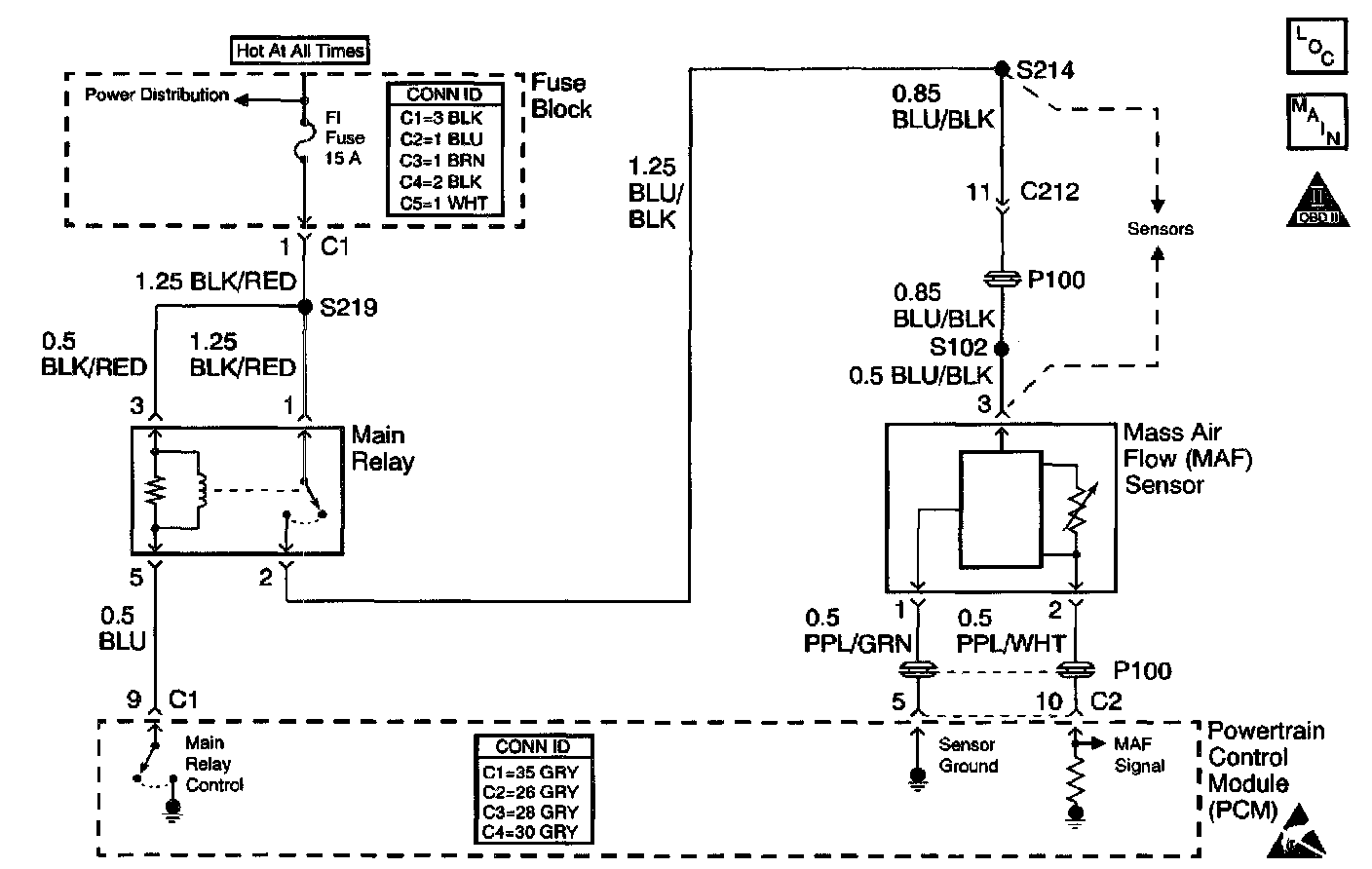 The Mass Air Flow (MAF) sensor measures the amount of air which passes through the sensor in a given amount of time. The Powertrain Control Module (PCM) uses this information to determine the operating requirements of the engine in order to control the fuel delivery. The PCM calculates the engine's fuel requirements by monitoring the current flow on the signal wire from the MAF sensor. When the volume of air entering the MAF sensor increases, the current flow seen by the PCM from the MAF sensor also increases. When the air flow decreases, the current seen by the PCM also decreases. The MAF sensor is located between the air intake tube and the air cleaner in the right front area of the engine compartment.