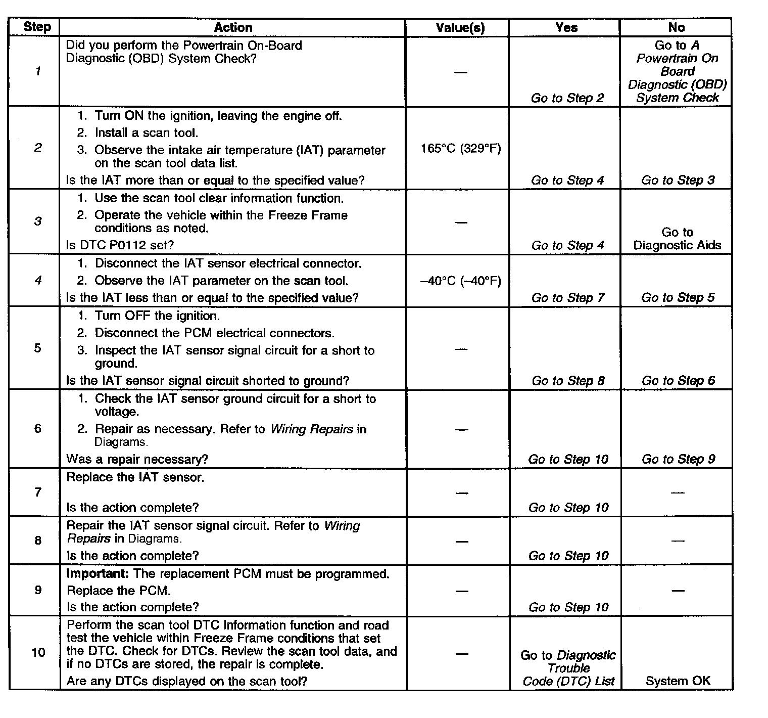 If the DTC P0112 cannot be duplicated, the information included in the Freeze Frame data can be useful in determining vehicle operating conditions when the DTC was first set.