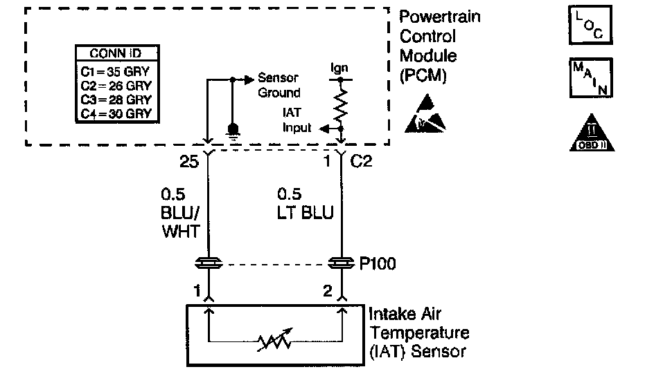 The Intake Air Temperature (IAT) sensor is a thermistor, a variable resistor whose conductive value changes with temperature, in series with a fixed resistor in the Powertrain Control Module (PCM). The PCM applies 5 volts to the IAT sensor. The PCM monitors the voltage across the IAT sensor and converts the voltage into a temperature reading. When the outside air temperature is cold, the IAT sensor resistance is high. When the outside air temperature is warm, the IAT sensor resistance is low. Therefore, when the air temperature is cold the PCM will receive a high voltage input, and when the air temperature is warm the PCM will receive a low voltage input.