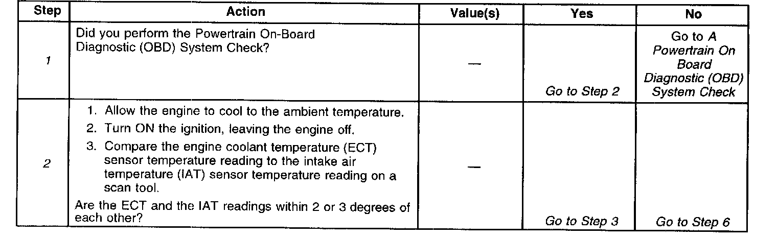 2. This step compares the Engine Coolant Temperature (ECT) temperature to the Intake Air Temperature (IAT). This inspection is to be performed when the vehicle has reached the ambient room temperature. At that time both the surrounding air temperature and the Engine Coolant Temperature are nearly equal. If the ECT sensor and circuit are OK, both sensors should indicate the same temperature.