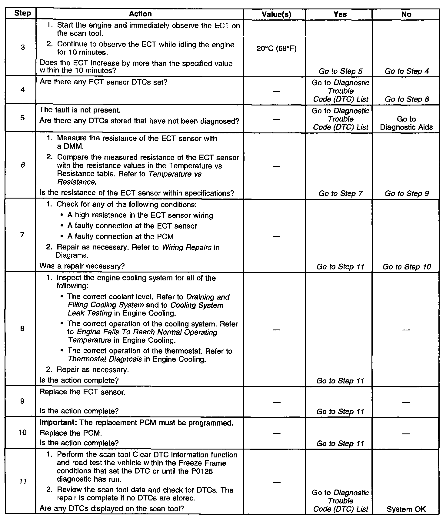 ^ A DTC P0125 that is set can indicate a skewed ECT sensor. Comparing the coolant temperature displayed on a scan tool with the actual Engine Coolant Temperature measured with a thermometer may isolate the fault. If the displayed Engine Coolant Temperature is not close to the actual Engine Coolant Temperature, replace the ECT sensor.