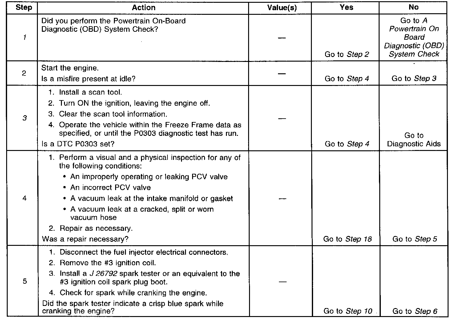 If a DTC P0303 is intermittent, driving the vehicle under the following conditions can verify whether the fault is present. Perform the scan tool Clear DTC Information function. Road test the vehicle while monitoring the DTC P0303 diagnostic on the scan tool under the Not Ran Since Code Cleared selection in the DTC Information menu. If a DTC P0303 appears in the Not Ran Since Code Cleared list, the P0303 diagnostic has not yet run. When the DTC P0303 does not appear in the Not Ran Since Code Cleared list, the P0303 diagnostic has run. If the MIL is NOT illuminated, and there is no Pending DTC Status in DTC Information, the P0303 diagnostic has passed. The DTCs MUST be cleared in order to view the Current Status of the Not Ran Since Code Cleared list. DO NOT forget that the Not Ran Since Code Cleared list only indicates that the test has run, not whether the test passed or failed. The DTC Information screen must be checked for Current or Pending status in order to determine the outcome of the diagnostic test involved.