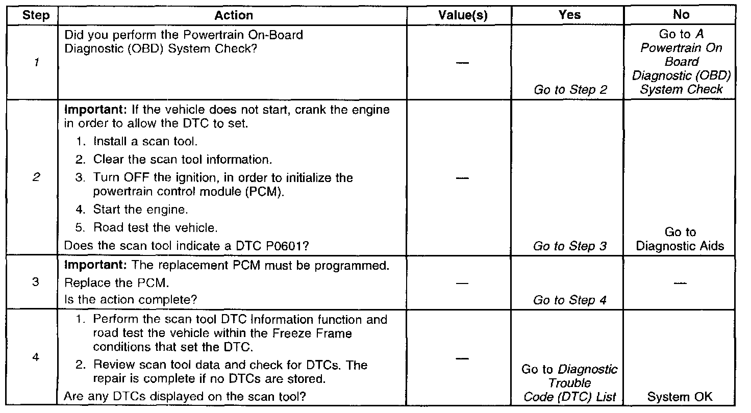 A DTC P0601 can set if an incorrect PCM is installed in the vehicle. Install the correct PCM according to the vehicle and/or the engine type and equipment options.