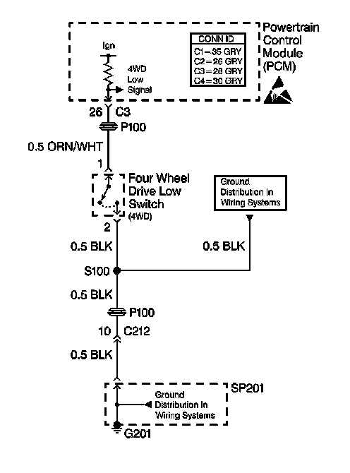 When the transfer case is shifted into the 4L position, the 4L switch closes. When the 4L switch closes, the 4L switch grounds the circuit to the powertrain control module (PCM) connector C3 terminal 3. The PCM uses the above information in order to prevent torque converter clutch (TCC) lock-up and 4th gear engagement.