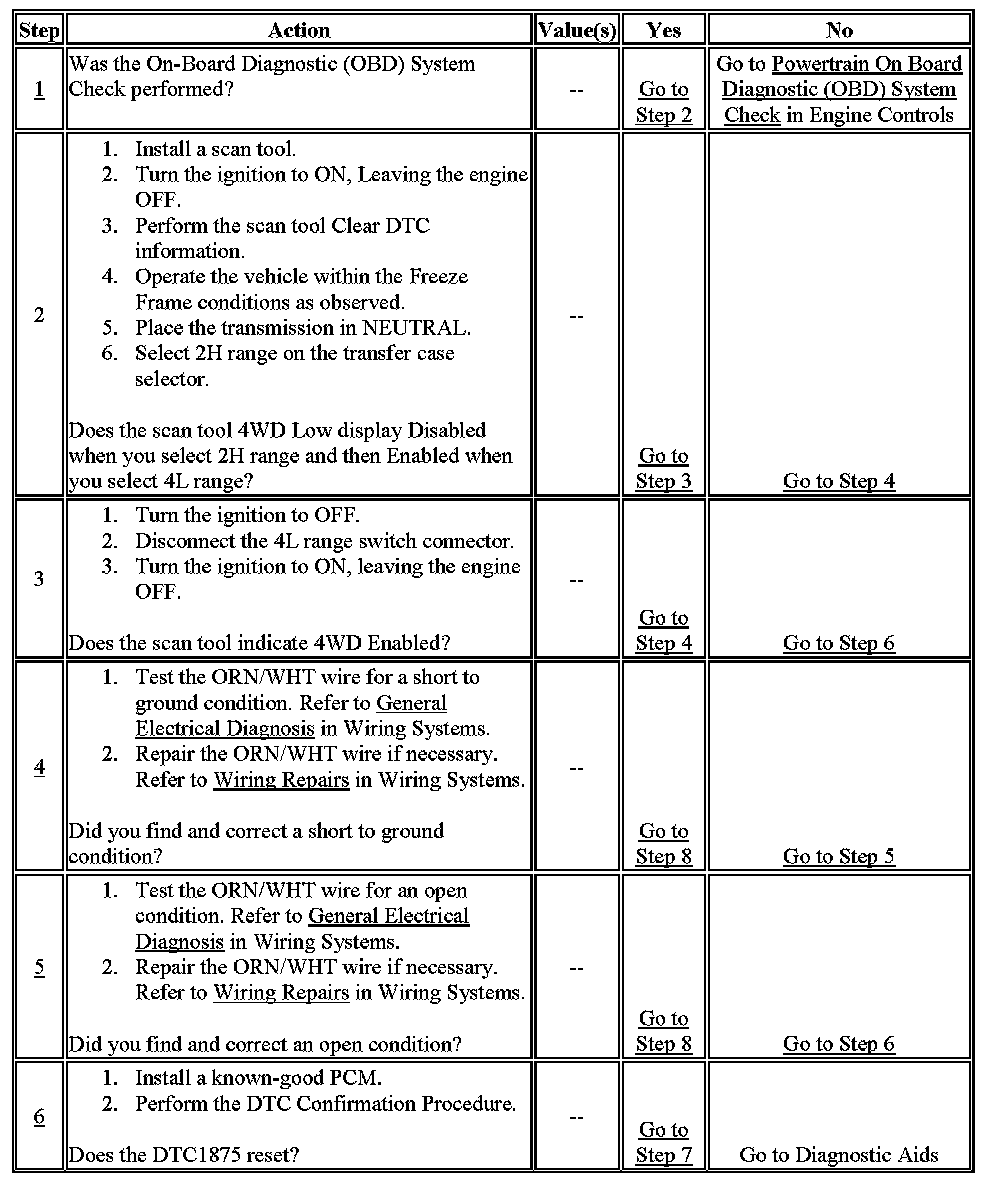 The PCM uses the vehicle speed sensor (VSS) in order to trigger DTC P1875. Vehicle speed differences between the above components trigger DTC P1875. If the VSS transmission does not function as designed, the transmission may set DTC P1875. The above action may occur even when the 4L signal circuit is both mechanically and electrically in good condition. DTC P1875 sets if the following condition occurs: