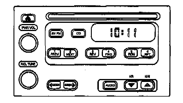 The ignition switch must be in the ACC position or in the ON position in order to operate the radio. If the ignition is in the OFF position, press the RCL/TUNE knob in order to display the time for 5 seconds. If the ignition switch is in the ACC position or in the ON position and the radio is turned off, the time will display. In this instance, all controls, except for the eject button and for the controls that are required to set the clock, will deactivate. The eject button has an up arrow and a line at the bottom. Press the PWR/VOL knob in order to turn the radio on. Turn the knob clockwise in order to increase the sound. In order to decrease the sound, turn the knob counterclockwise. Press the PWR/VOL knob again in order to turn the radio off.