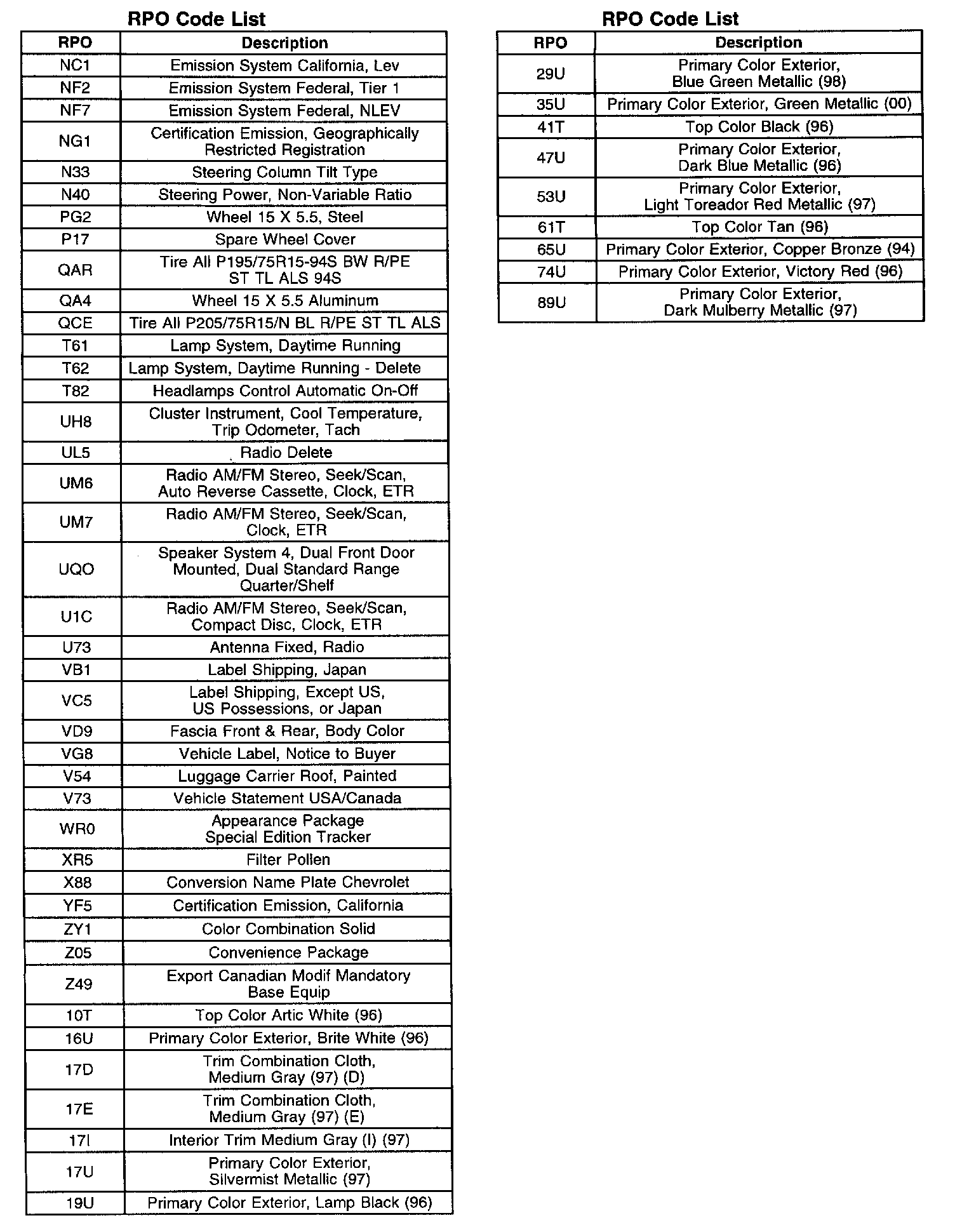 RPO Code List (Part 2 Of 2):