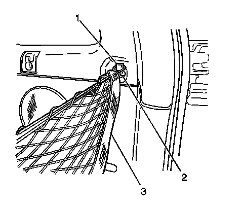 1. Install the rear compartment convenience net (3) to the vehicle. Secure the net by attaching each of the loops to the respective hook and bracket (1).