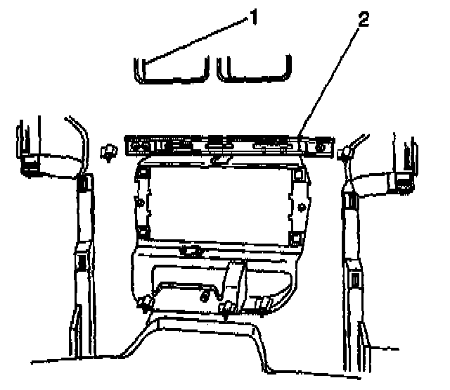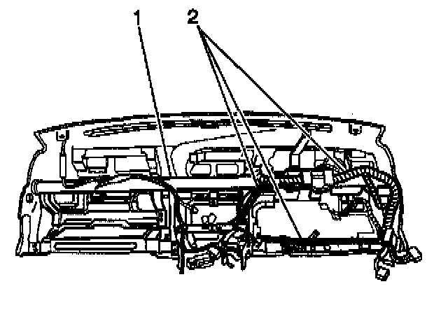 41. Remove the 2 upper IP mounting bolts (1) which secure the instrument panel (2).