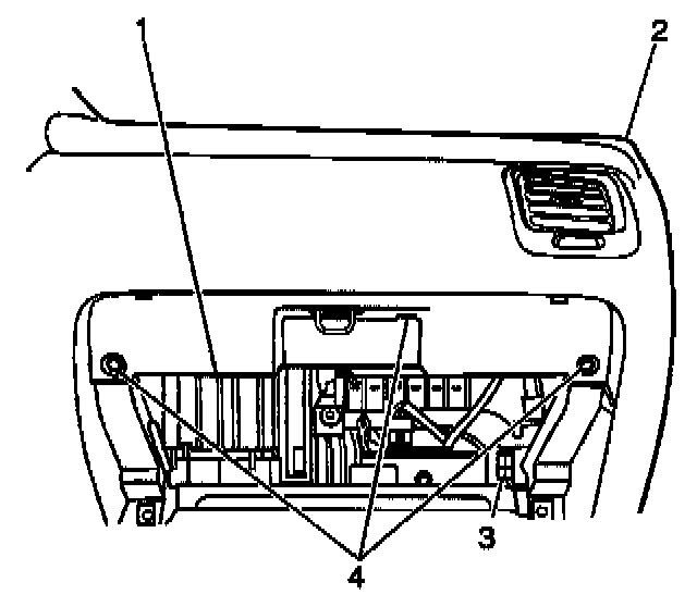 37. Remove the 2 center IP mounting bolts (4) which secure the instrument panel (2) at each side.