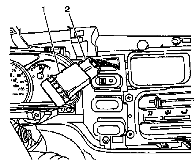 39. Remove the left upper IP bolt trim cover (1) from the instrument panel (2).