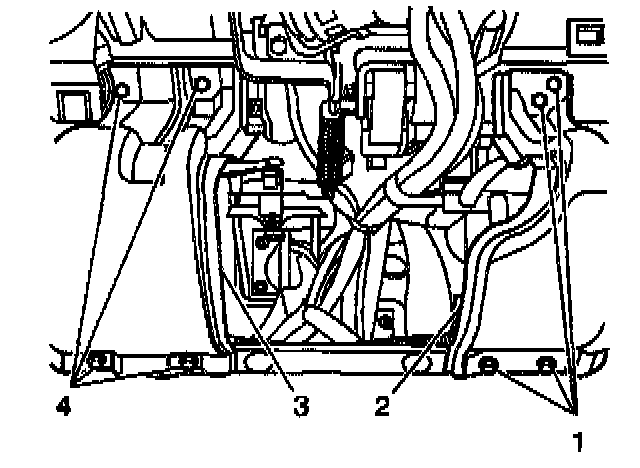 36. Fold back the floor panel carpet around the center of the instrument panel (2) in order to access the 2 center IP mounting bolts (4) at each side.