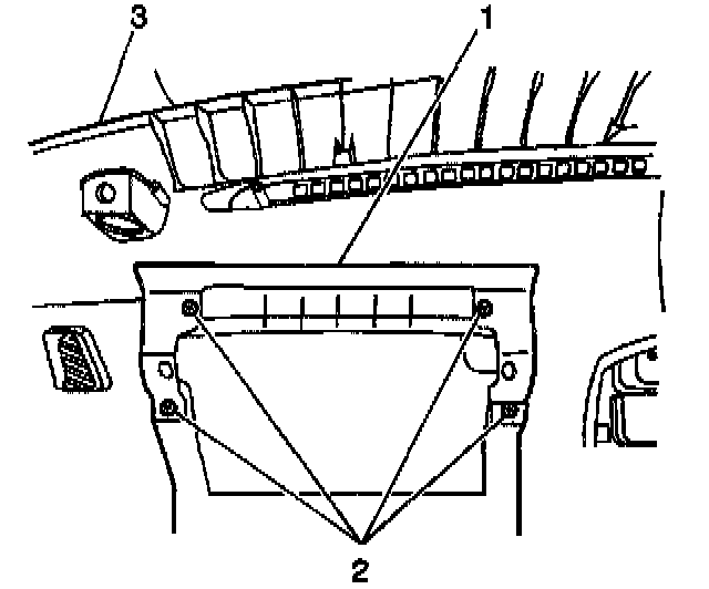 26. Remove the screw (2) which secures the hood latch release handle (1) to the instrument panel (3).