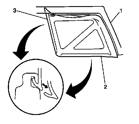 1. Install the side window by sliding in rearward and up in order to hook the bottom end (2) and the front end (3) of the side window.