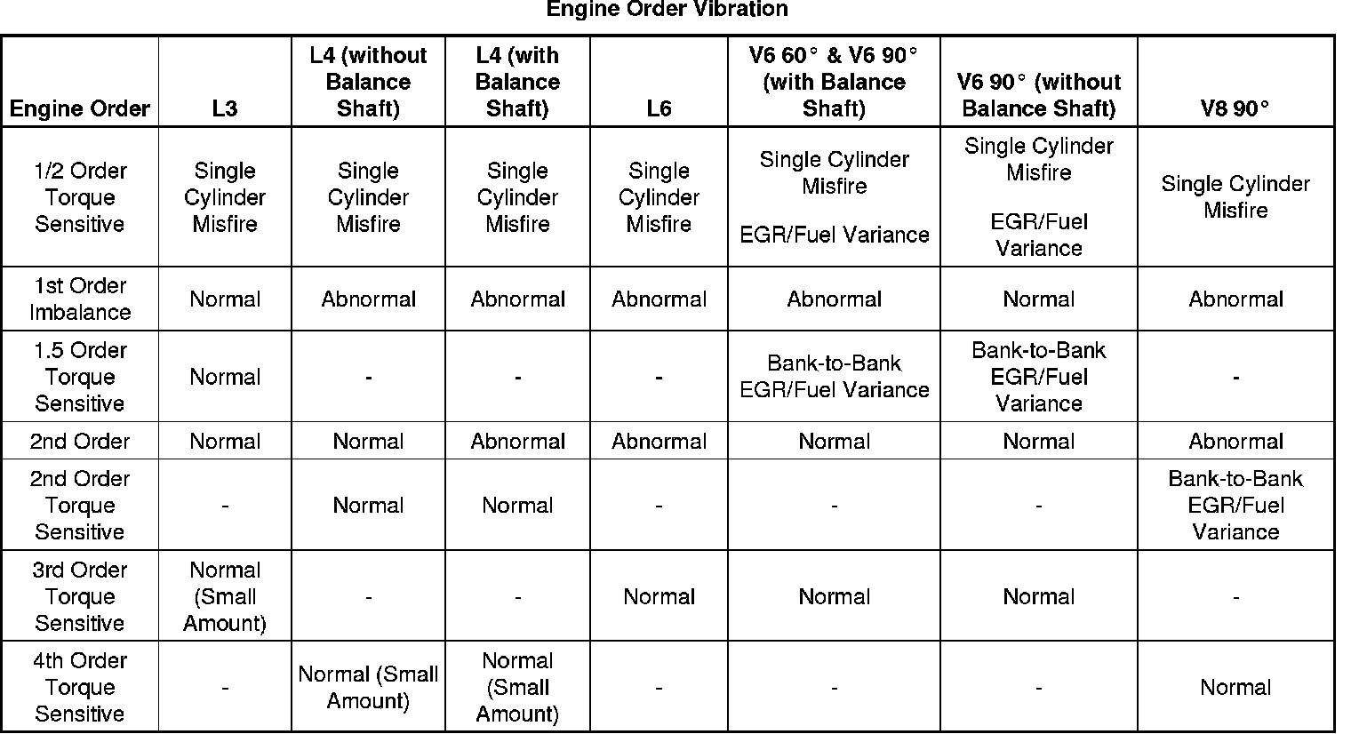Important: The frequency of these disturbances will depend on the number of cylinders. The engine order will always be equal to one-half the number of cylinders. This is because a four-stroke engine requires 2 complete revolutions of the crankshaft in order to fire all of the cylinders.