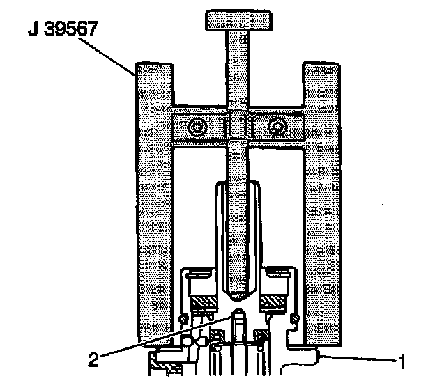 4. Push the J 39567 pin down until it touches the master cylinder piston (2).