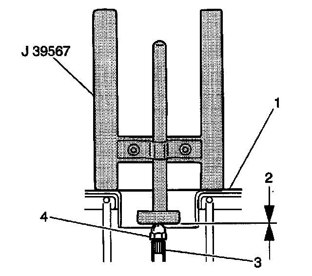 ^ The clearance (2) between the booster piston rod (3) and the J 39567 should be 0 mm (0 inch).