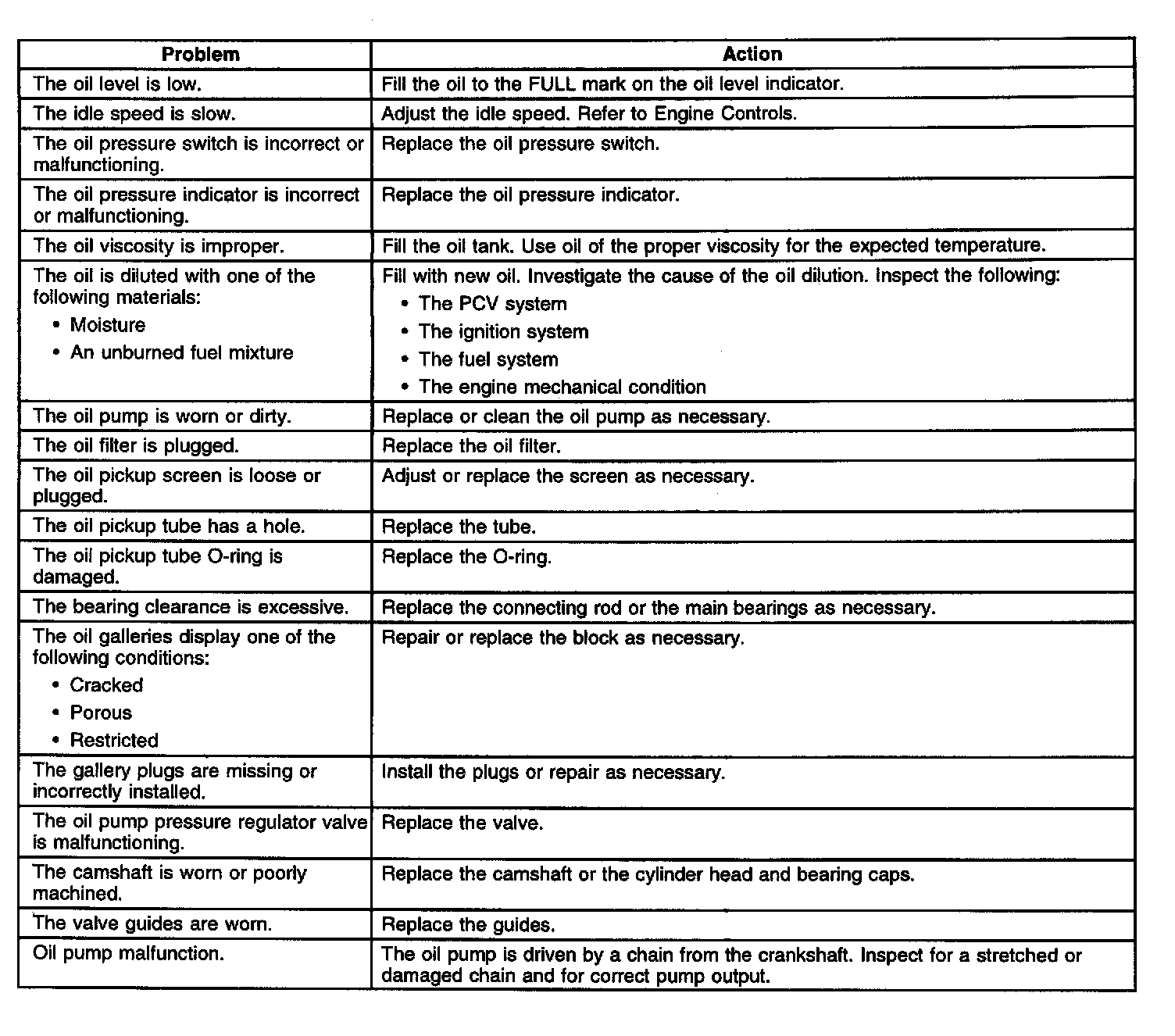 6. If the oil pressure is below specification refer to the following table.