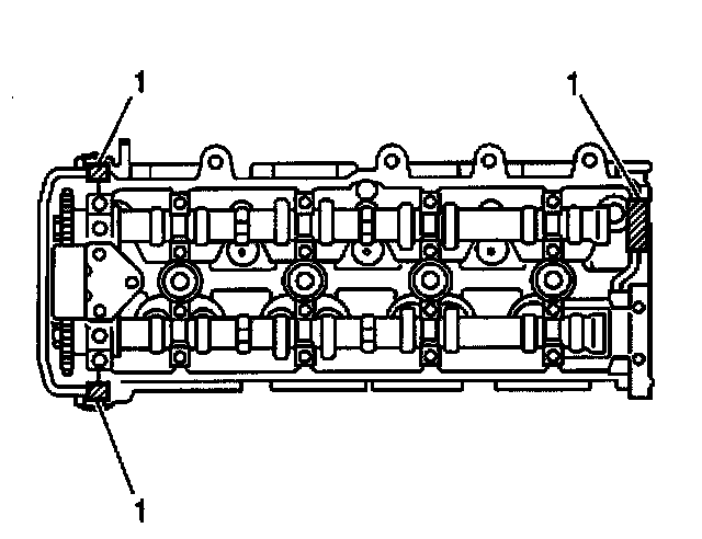 3. Apply GM P/N 12345997 or equivalent to the cylinder head at the points indicated (1).