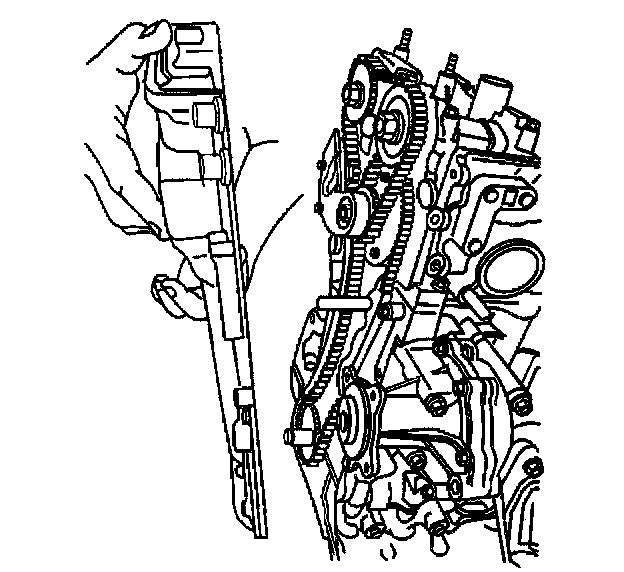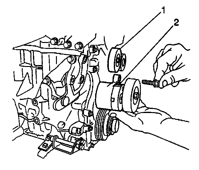 1. Remove the oil pan. Refer to Oil Pan Removal.2. Remove the 2 bolts and the accessory drive belt tensioner (2).